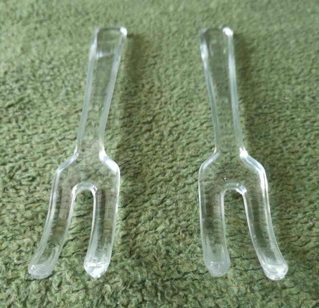 11Oferuję dwa stare szklane widelce do sałaty. Pochodzą z lat 60/70 ubiegłego wieku. Wykonane są ze szkła prasowanego i ...